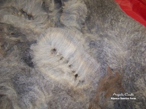 Cosette is 13/16 Peruvian and 3/16 Chilean. Her fleece has defined crimp and density.